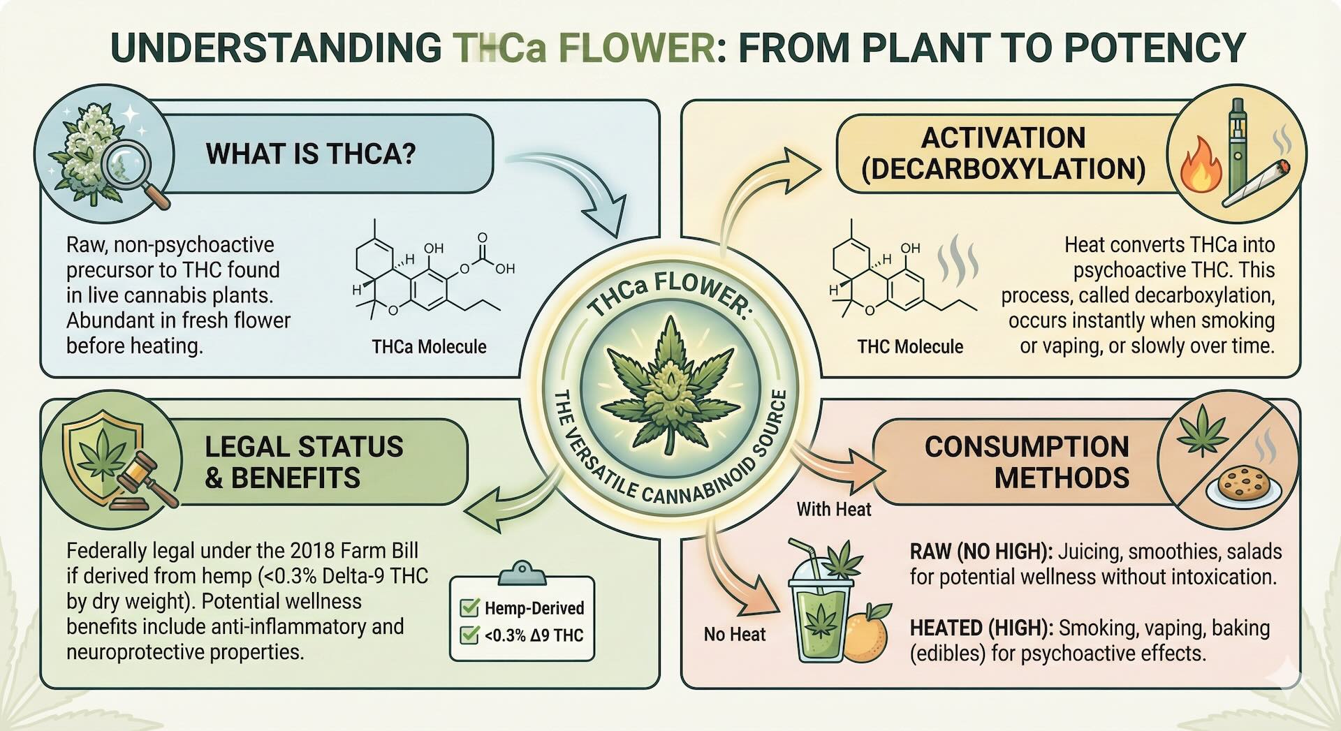 - You can consume THCA flower raw for wellness benefits or heat it for traditional cannabis effects