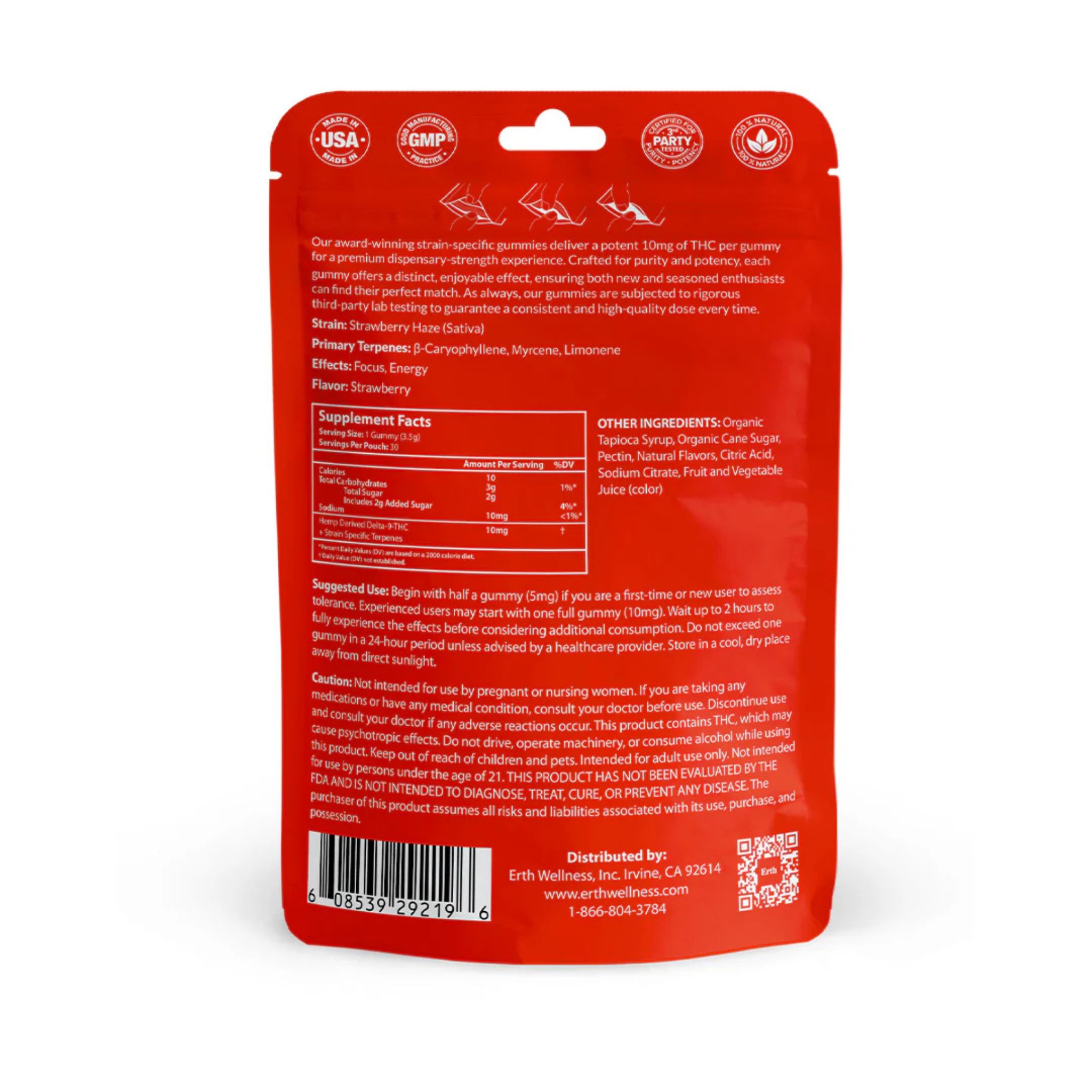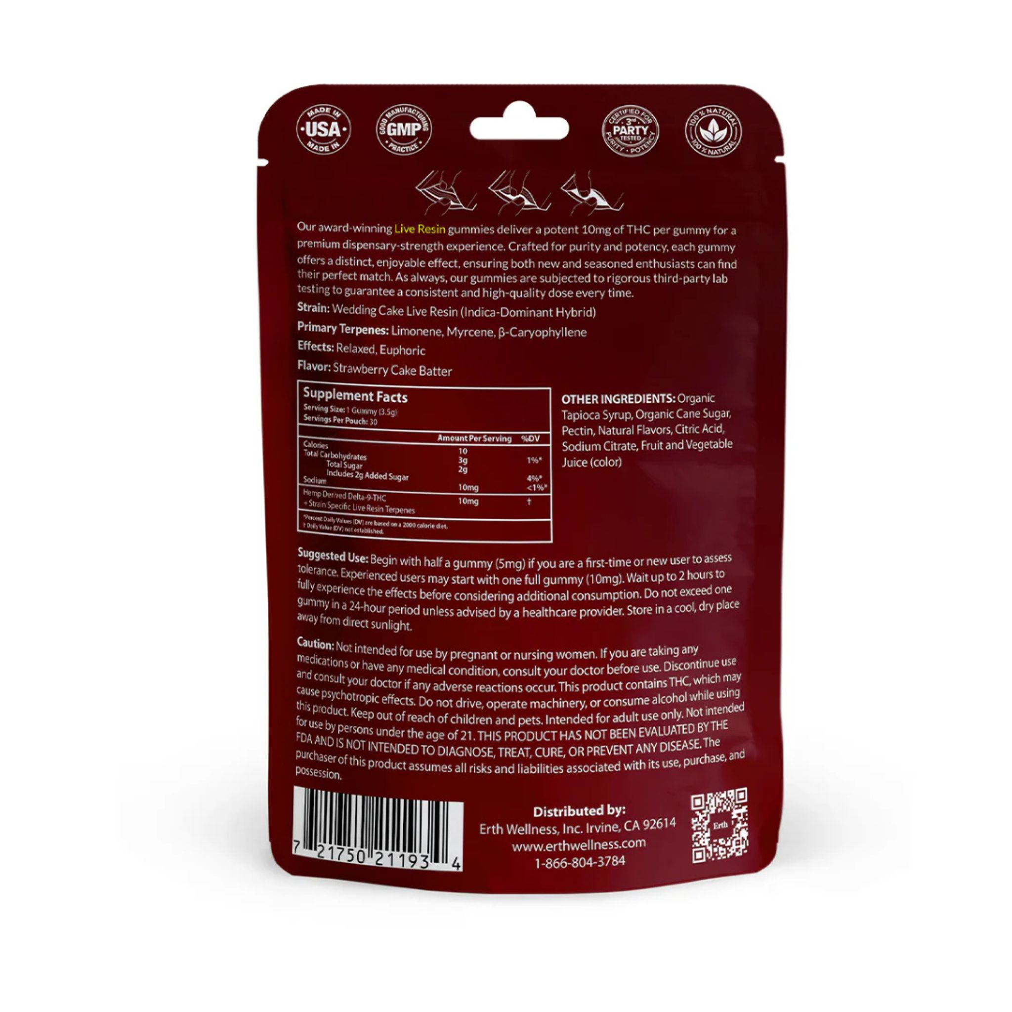 Erth Wellness formulates each gummy batch with live resin terpenes from specific hemp strains such as Jack Herer or Pineapple Express. That terpene profile helps shape the flavor and feel of the Delta 9 THC experience in each variety.