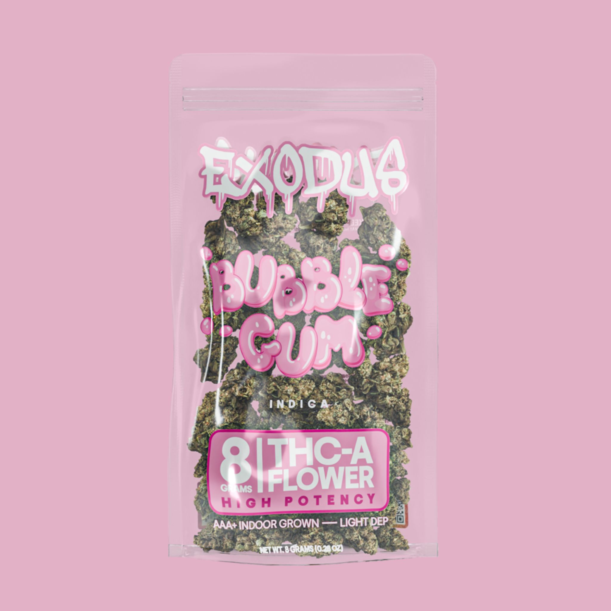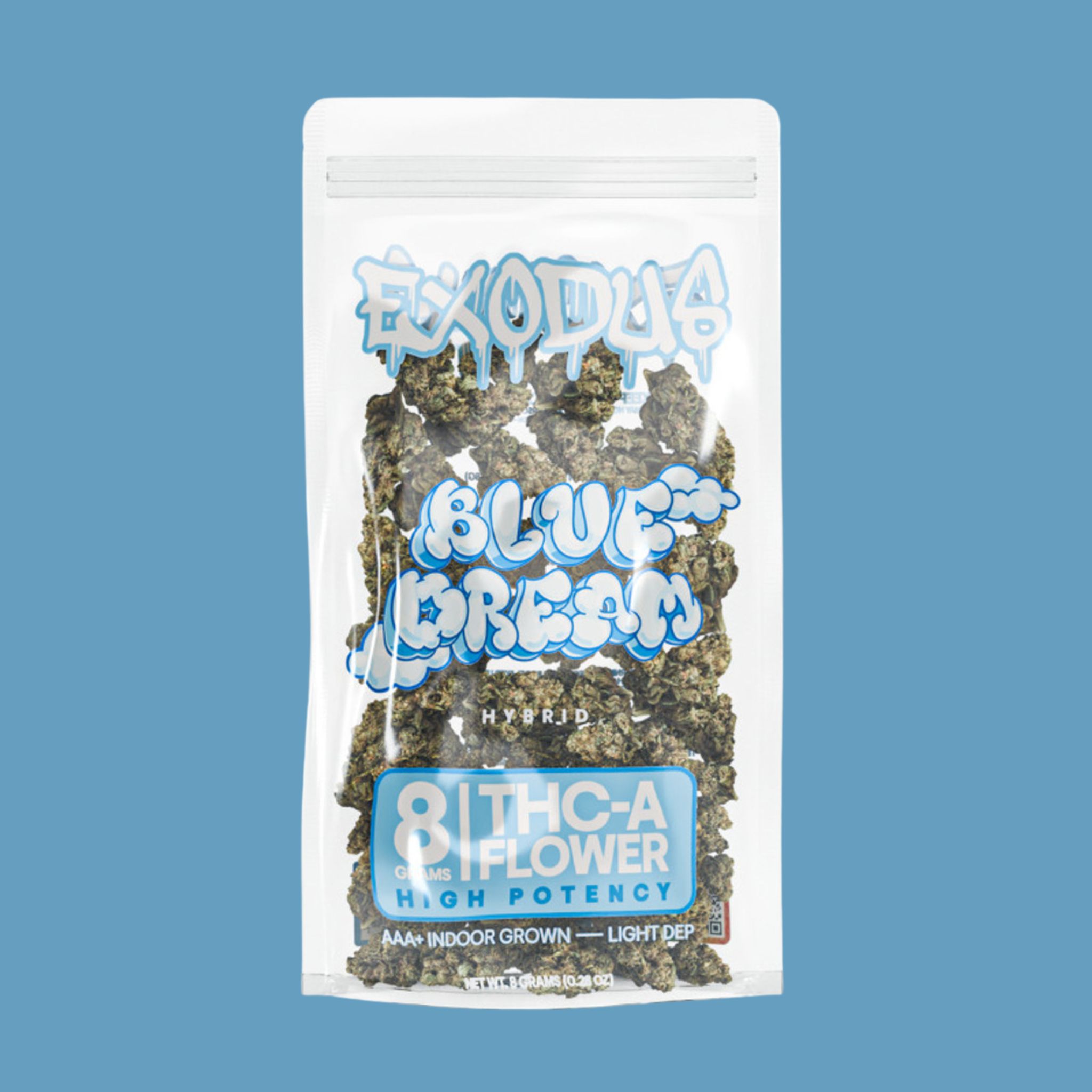 Packaging Content: Each bag contains 8 grams of Exodus THCA Flower. The packaging is designed to preserve terpene integrity and freshness, featuring an air‑tight, resealable pouch that allows viewing of vibrant buds through a clear window.