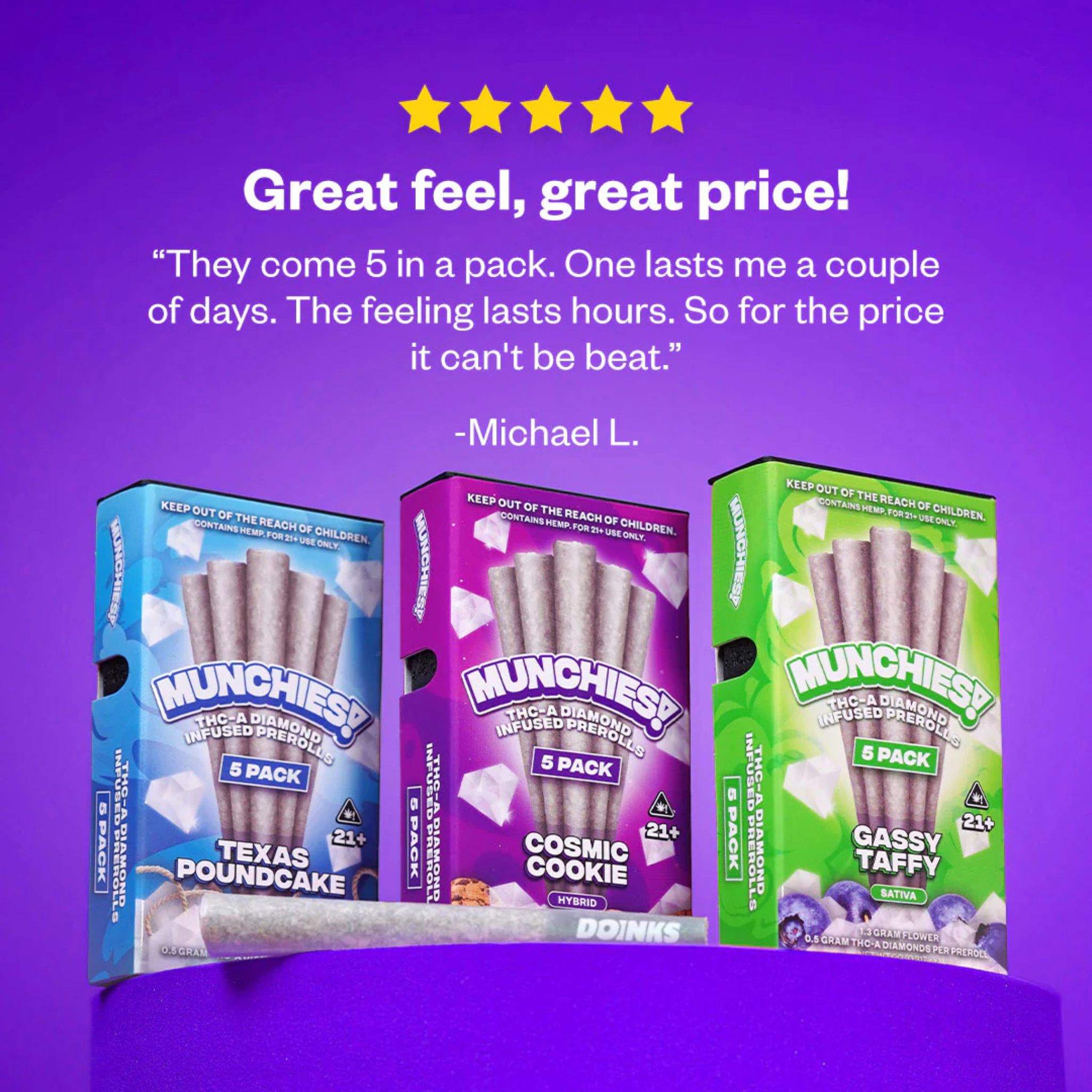 Munchies Pre Rolls contain 30% THC-A potency. This makes them a powerful option for experienced users seeking strong effects. Each joint combines premium flower with THC-A diamonds for maximum impact.